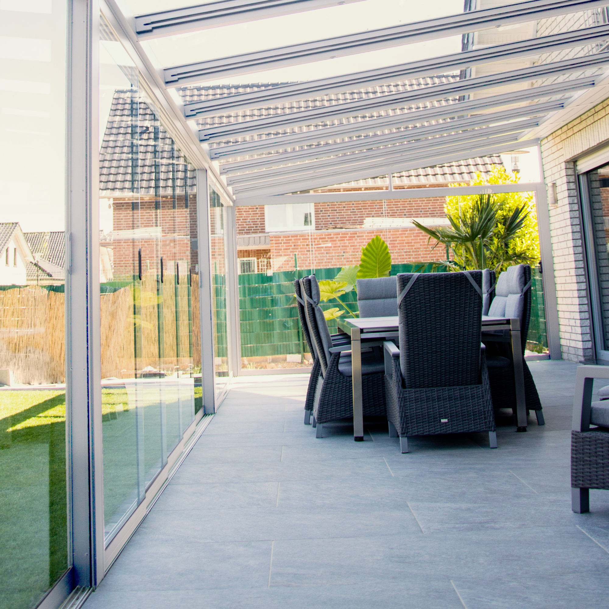 *Dreamgarden Überdachungen können mit Glasschiebewänden und LED-Einbauleuchten erweitert werden (Nicht im Lieferumfang)