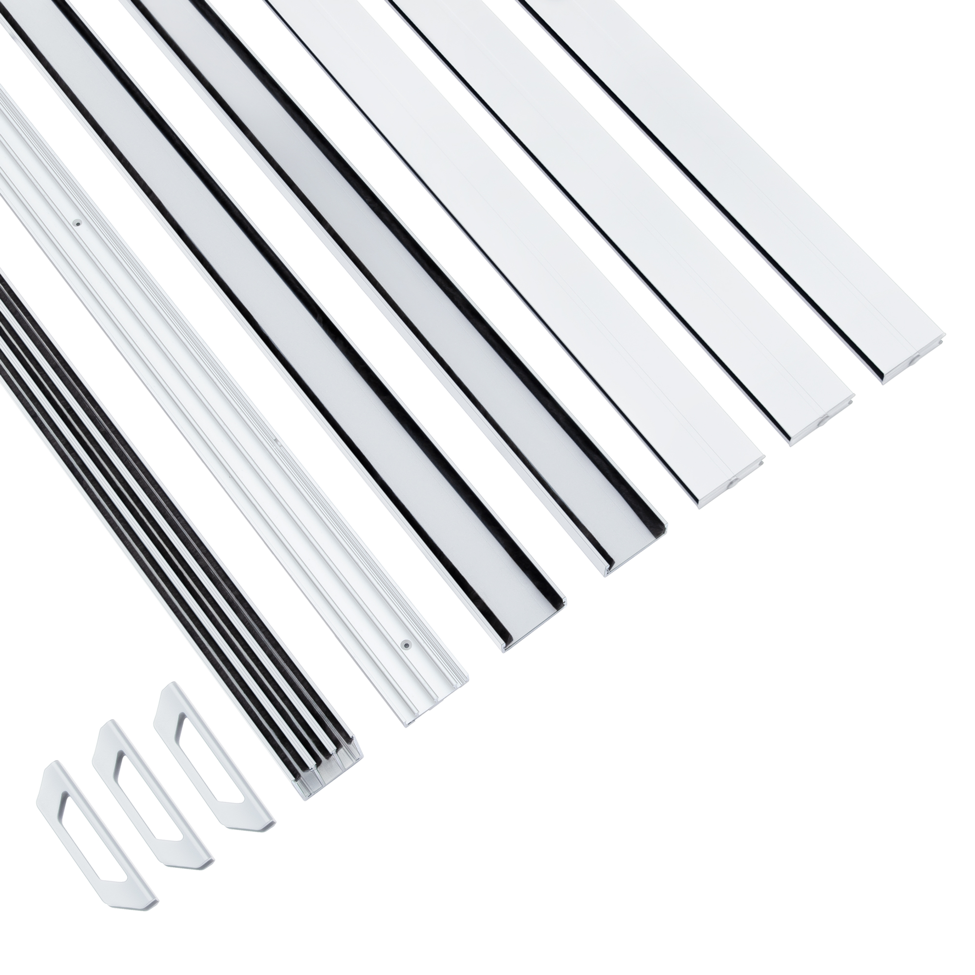 Schienensystem mit Seitenprofilen aus Aluminium inklusive Abschlusskeil, Glasplatten und Türgriffen