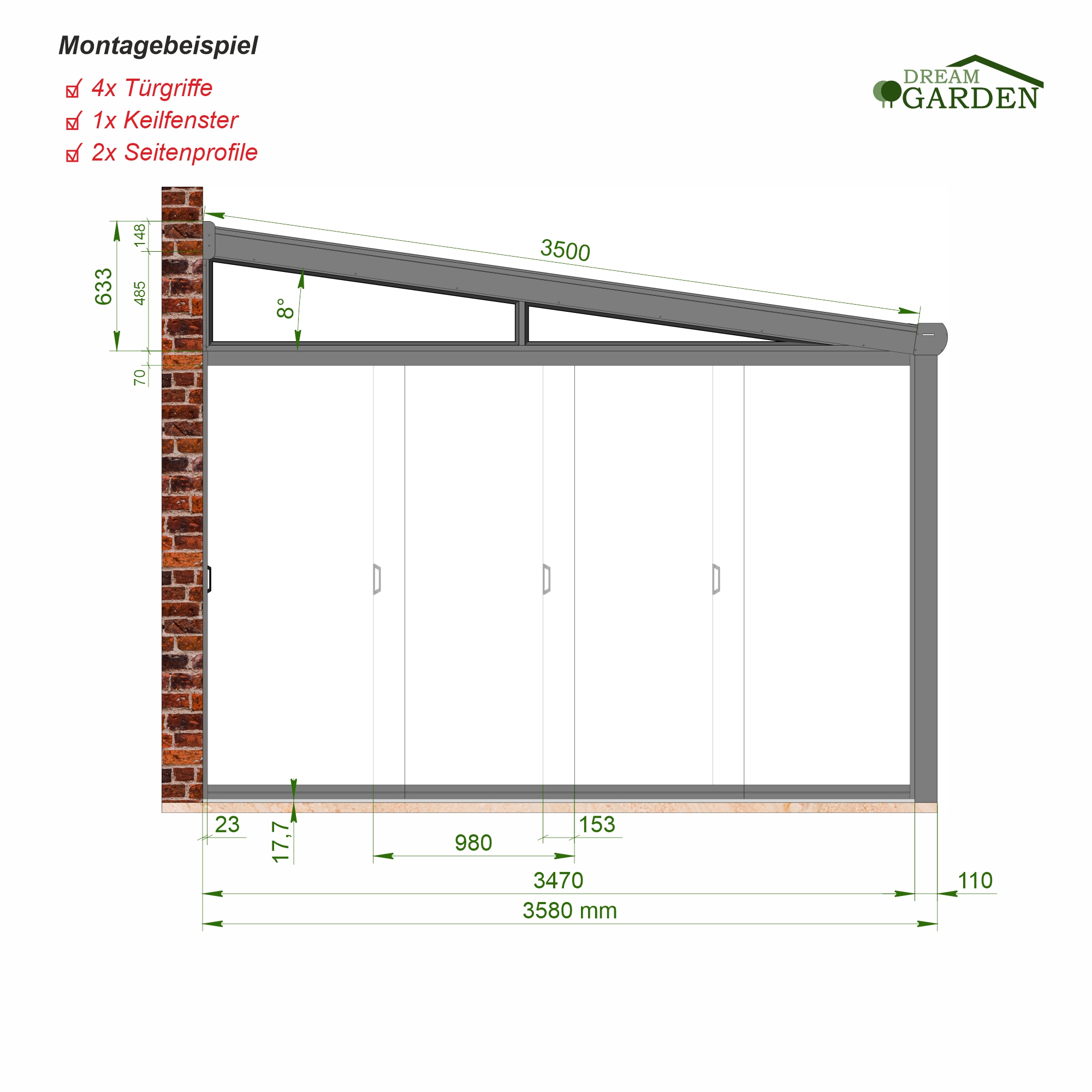 *Dreamgarden Schiebewände können mit Unterbau-Tragprofil, Zugluftstopper und Türmitnehmer erweitert werden (Nicht im Lieferumfang)
