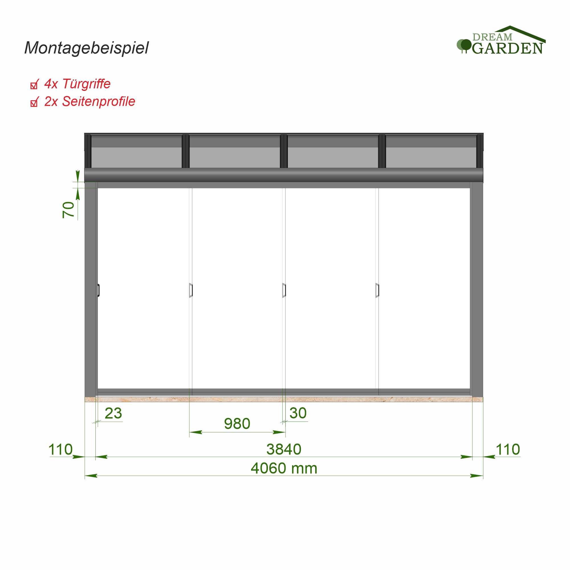 *Dreamgarden Glasschiebewände können mit Unterbau-Tragprofil, Zugluftstopper und Türmitnehmer erweitert werden (Nicht im Lieferumfang)