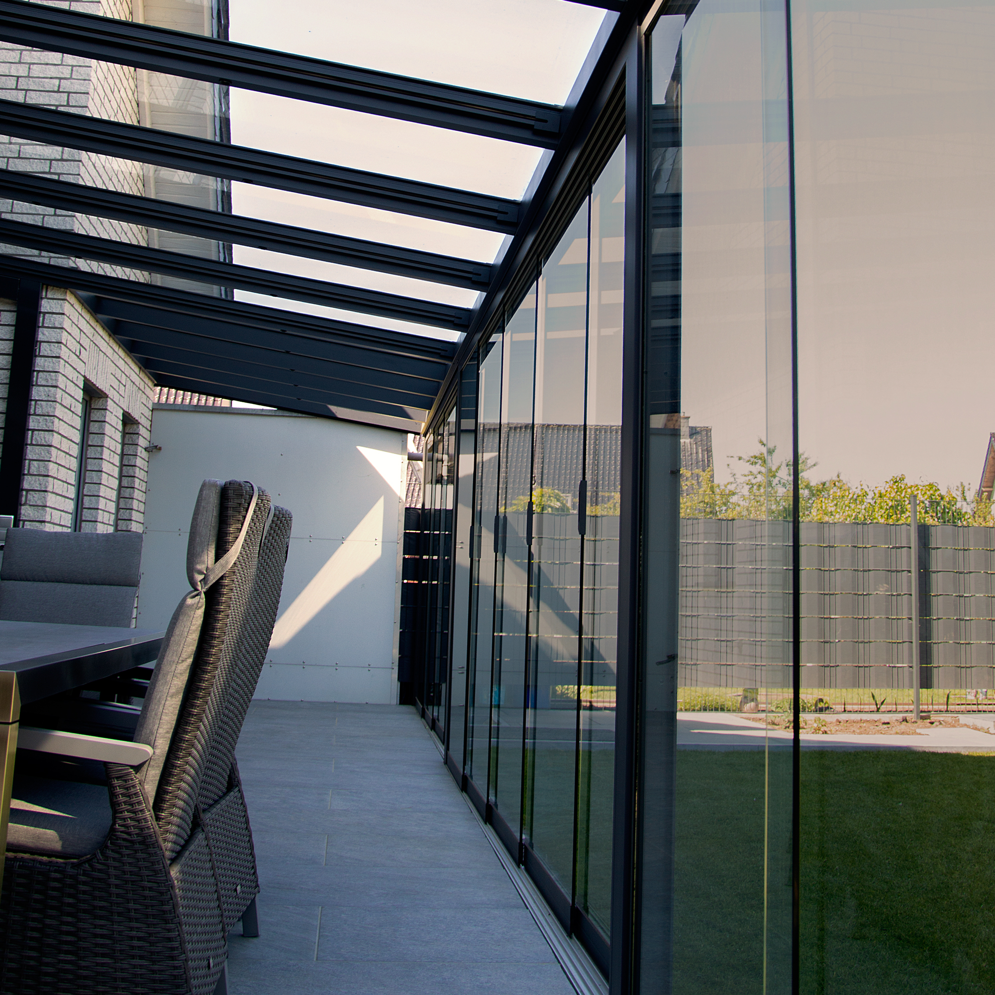 Entspannen Sie sich bei jedem Wetter auf Ihrer Terrasse mit den Glasschiebewänden von Dreamgarden und genießen Sie die Aussicht durch beständiges Sicherheitsglas. Die hochwertig produzierten Schiebewände schützen optimal vor Kälte, Wind und Niederschlag und ermöglichen die Nutzung Ihrer Terrasse rund um das ganze Jahr.